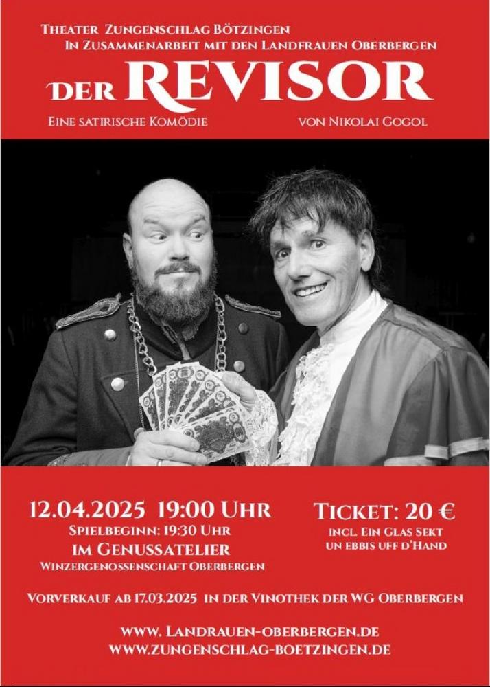 In Zusammenarbeit mit den Landfrauen OberbergenDER REVISOR: Eine satirische Komödie von Nikolai GogolVorverkauf in der Vinothek Einlass 19 UhrSpielbeginn 19:30…